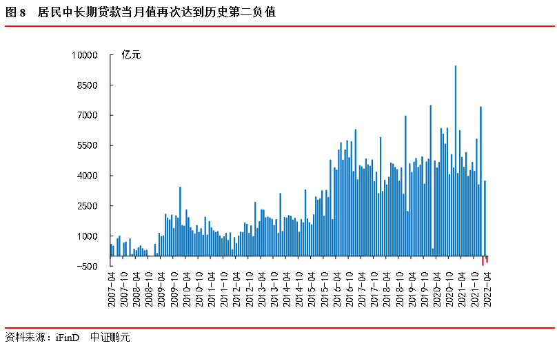 居民端:短期貸款同比少增,疫情頻發影響下居民貸款和和消費信心和意愿不足;中長期貸款當月值繼2月突破歷史負值后再次達到負值。居民貸款減少2,170億元,同比少增7,453億元。居民短期貸款減少1,856億元,同比少增2,221億元,4月國內疫情嚴重,抑制居民的日常消費需求與短期貸款意愿。居民中長期貸款減少313.72億元,同比少增5,231億元,繼2月單月值達到歷史負值后,4月再次達到歷史負值,主因商品房銷售疲弱,居民信貸弱,按揭貸款不足,房地產低迷。4月住房貸款減少605億元,同比少增4,022億元,拖累居民信貸接近一半。