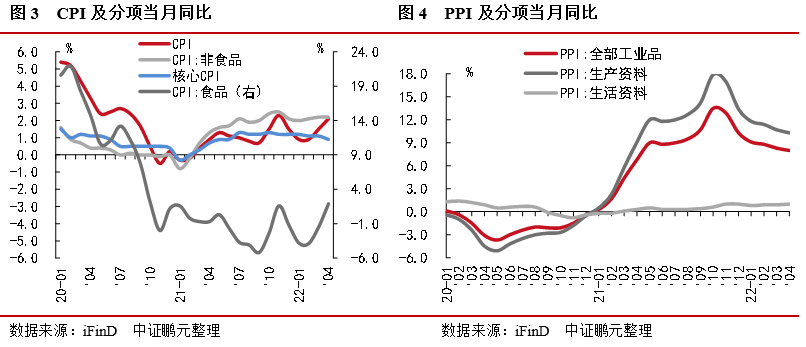 4月CPI同比上漲2.1%,較上月擴大0.6個百分點,核心CPI同比上漲0.9%,較上月回落0.2個百分點;4月PPI同比上漲8.0%,較上月回落0.3個百分點;