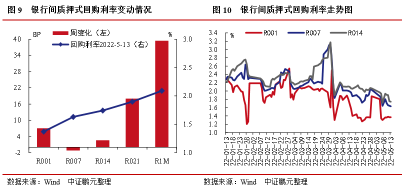 上周流動性相對平穩,回購利率漲跌互現。具體來看,隔夜利率較前一周上行7.05BP至1.37%,7天回購利率下行1.21BP至1.63%。中等期限方面,14天回購利率上行2.55BP至1.74%,21天回購利率上行18.01BP至1.9%,1個月回購利率上行39.4BP至2.09%。