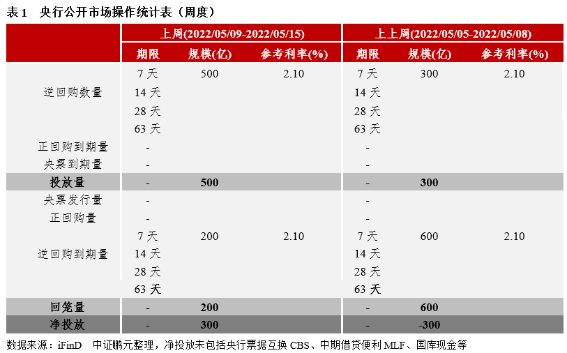 上周(2022/05/09-2022/05/15)央行7天逆回購投放500億元,7天逆回購到期200億元,合計凈投放300億元。上周多空交織,債市主要交易社融數據,債券收益率震蕩。當前疫情拐點已現,上海疫情逐步好轉且復工復產在持續推進、北京疫情仍處于波動中但新增感染人數并未出現大幅增加,疫情的影響雖然在持續但逐漸消化,重點關注穩增長政策的加碼和落地效果。貨幣政策繼續保持穩健,整體流動性合理充裕,總量的降息可能性較?。ń档蚆LF和7天逆回購利率),主要掣肘于通脹和國外加息,5月LPR單邊調低的可能性極大。