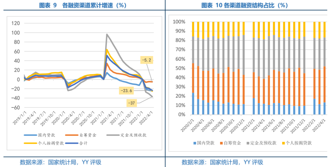 另一方面,經濟走弱下收入預期的下降導致購買力降低+對地產行業悲觀預期+疫情限制銷售等多重利空因素壓制銷售端反彈無力,4月銷售金額累計同比下滑近30%。拿地端從4月以來的集中供地表現來看,除深圳外平均溢價率僅2.73%,天津、南京、濟南和東莞的流拍率較高,且多以國企和當地平臺托底為主。此外,資金到位的規模和結構仍在惡化,預收房款和按揭的下降反映購房需求疲軟依舊。