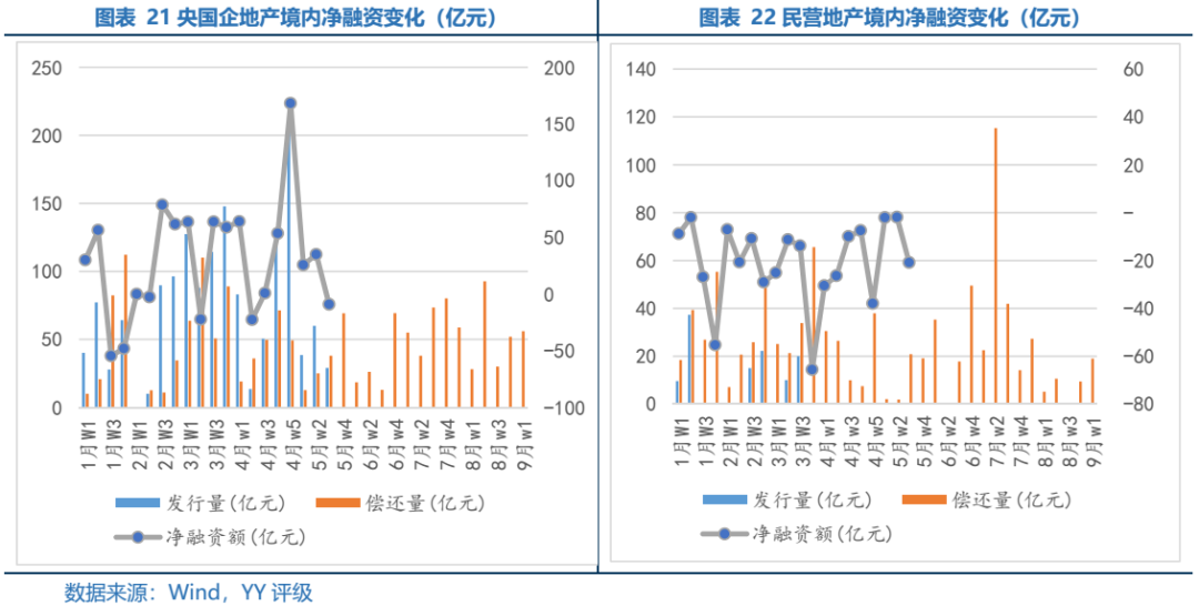公開債券發行端,截止到5月15日,22年央國企開發商凈融資累計611億,各周基本能保持凈流入,民企開發商累計凈償還507億,從1月以來連續各周均表現為籌資現金流凈流出,同時民企在6、7月還將面臨單周115億的到期,壓力仍大。