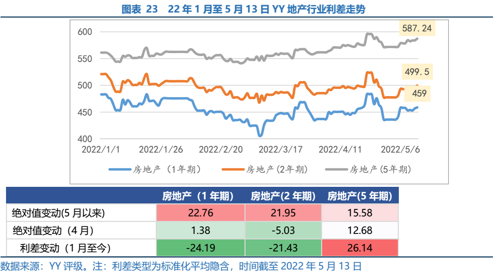 YY地產利差在3月初走過階段性低點后整體繼續呈現上行態勢,4月1、2、5年期行業利差波動,分別變動1.4、-5.0和12.7, 5月恢復上行趨勢,1、2、5年期行業利差分別上行22.8、22.0和15.6,資金撤離民營房企,行業估值風險未退。