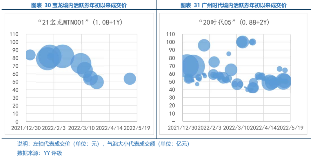 尚未展期/違約的民企方面,受行業內主體負面信用事件影響,尚未展期/違約主體的市場成交價呈下探趨勢,但不同資質主體成交價區間分層。碧桂園“福州事件”引發市場關注,“20碧地01”價格下跌至80元左右;因旭輝22年到期的境內債券均已到期償付,給予市場一定信心,“21旭輝01”自4月下旬以來成交價在80元左右徘徊;寶龍22年為債券大年,且兩度推遲披露年報,“21寶龍MTN001”由80元檔一路下跌,目前成交在54元;時代向廣州市政府懇請退地,表明舊改項目資金沉淀壓力較大,“20時代05”跌至40元檔位。