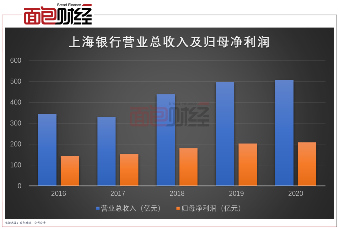 數(shù)據(jù)顯示,2020年上海銀行實現(xiàn)營業(yè)收入507.46億元,同比增長1.90%;實現(xiàn)歸屬于母公司股東的凈利潤208.85億元,同比增長2.89%。