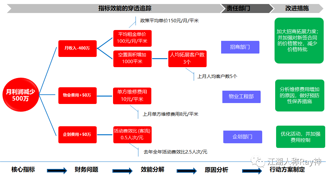 對于企業管理者而言,效能分析最直觀的體現就是財務指標。整理財務指標的常用方法可以參考杜邦分析等方法。指標配合到前面說的衡量依據,就可以用來評估效能了。比如:從組織效能出發的人均利潤、人均收入等;又比如:從空間效能出發的平米租金、單方成本、單方費用等;再比如:從資金效能出發的自有資金回報率(ROIC)、經營利潤率等。
