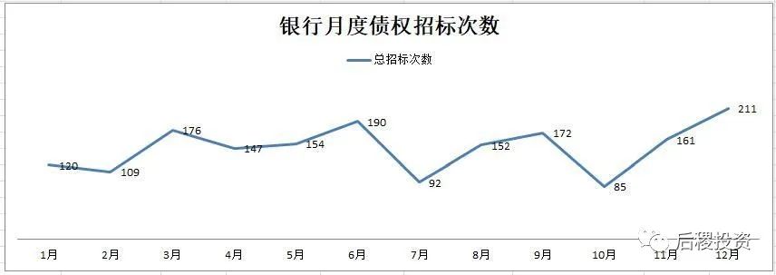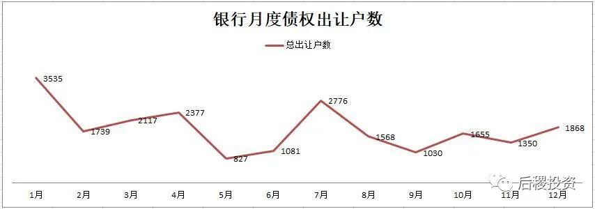 除1月外,銀行月度出讓次數曲線的區間為94-206次,區間中值為150次左右,戶數區間為827-2776戶,區間中值為1800戶左右,而月度出讓成交金額的區間中值則為350億元左右。1月和7月是公告成交的高峰期,這與業務規律也契合。