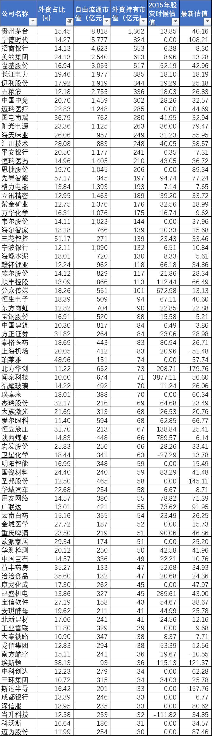 最后附一個外資持股比例(>10%)和持股市值規(guī)模較大(>30億元)的股票情況,現(xiàn)在有沒有跌到位,見仁見智了。