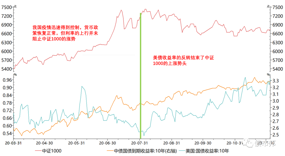 從下圖可以看到,中證1000指數的重要拐點,均與美債的底部頂部密切相關。
