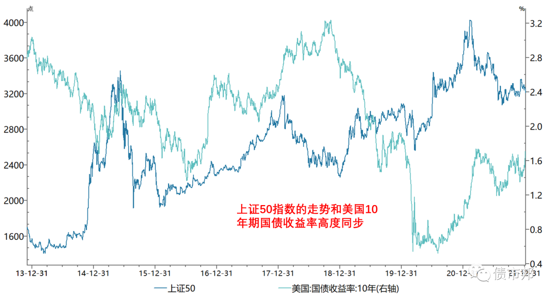 有意思的是,代表大票的上證50指數,卻和小票相反,走出了和美債高度正相關的走勢。