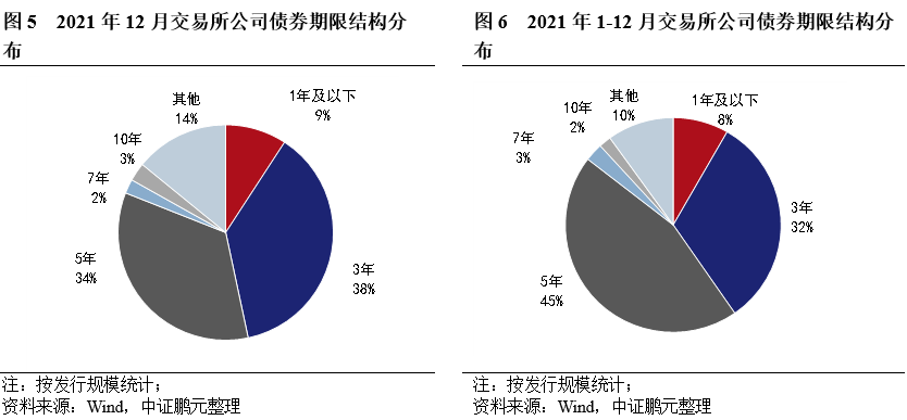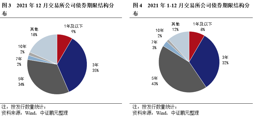 綜合2021年1-12月份來看,3年期的交易所公司債券發行1,303只,累計發行規模11,065.76億元,占比分別為32%和32%;5年期的交易所公司債券發行1,760只,累計發行規模15,602.80億元,占比分別為43%和45%。分債券品種而言,1-12月份3年期和5年期公募公司債發行數量分別占比34.5%和43.9%,發行規模占比分別36%和42%;3年期私募債發行數量和發行規模分別占比31%和43%,5年期私募債發行數量和發行規模分別占比28%和48%。