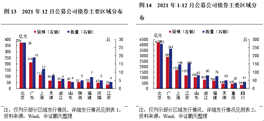 區域分布方面,12月份公募公司債券主要集中于北京、廣東、上海等地,私募公司債券主要集中在江蘇、山東、浙江等地。