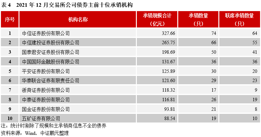 主承銷商方面,12月份共82家機構參與交易所公司債券承銷,中信證券、中信建投證券和國泰君安的承銷規模分別位居前三位。