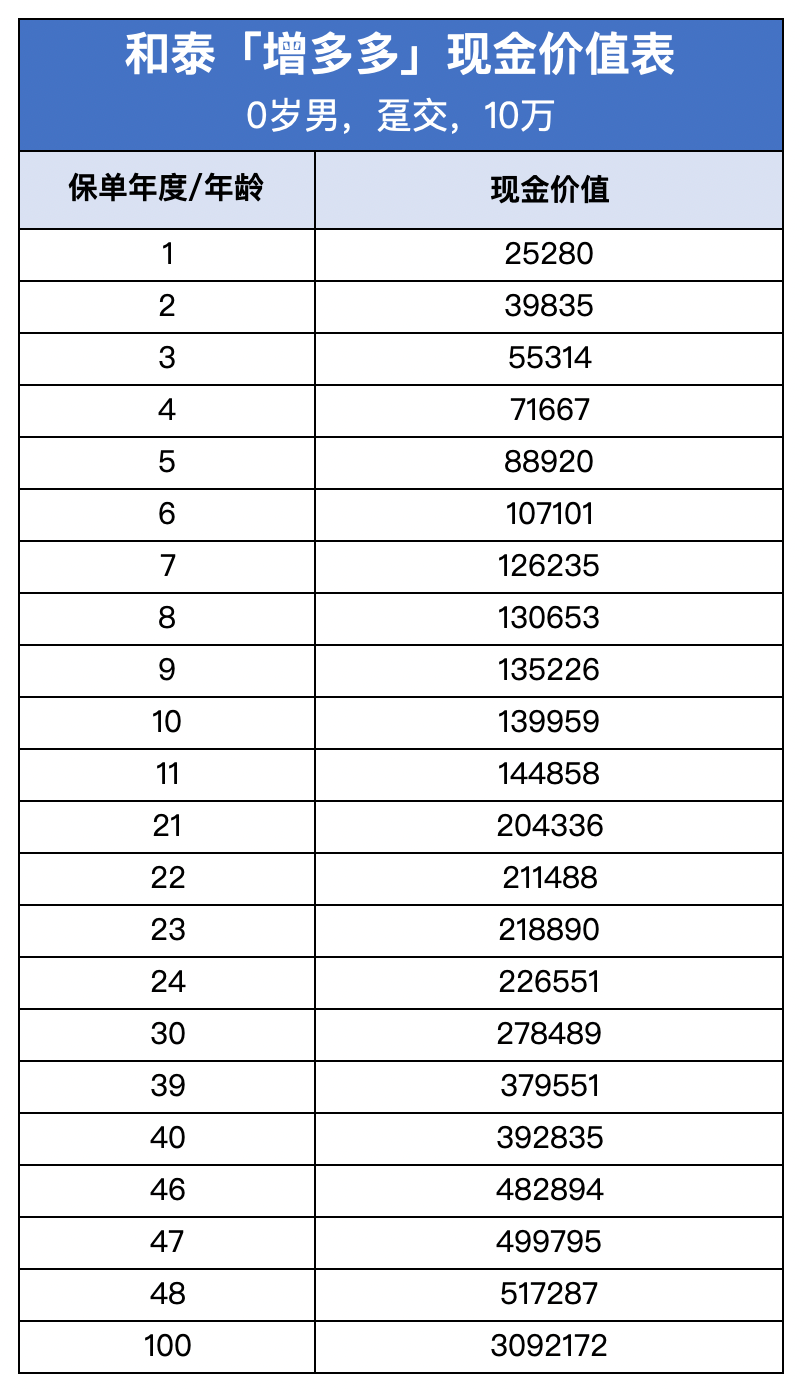 我給老公選的是增多多增額終身壽險,每年交10萬,交10年,一共100萬,主要給他當做今后的養老金。