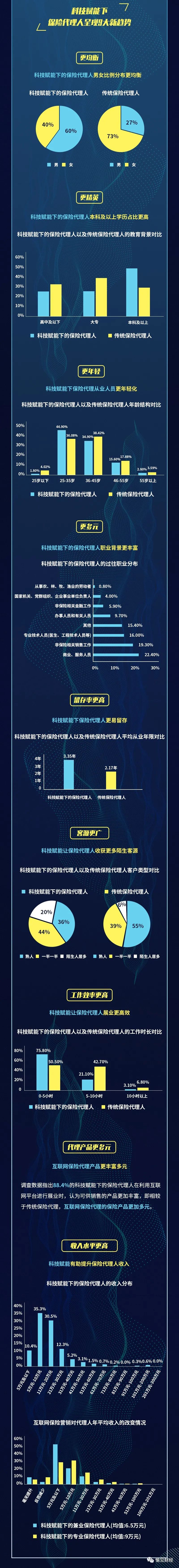 和工作時長變短同時發生的,還有收入的不降反增。據調查,有87.5%的科技賦能下的保險代理人認為年收入在一定程度上有所增加,98.2%的代理人認為“互聯網+”及保險科技賦能保險營銷,將革新傳統保險代理模式,對業績提升具有幫助作用。(更直觀了解科技賦能之下保險代理人群體的新趨勢,請見文末長圖)