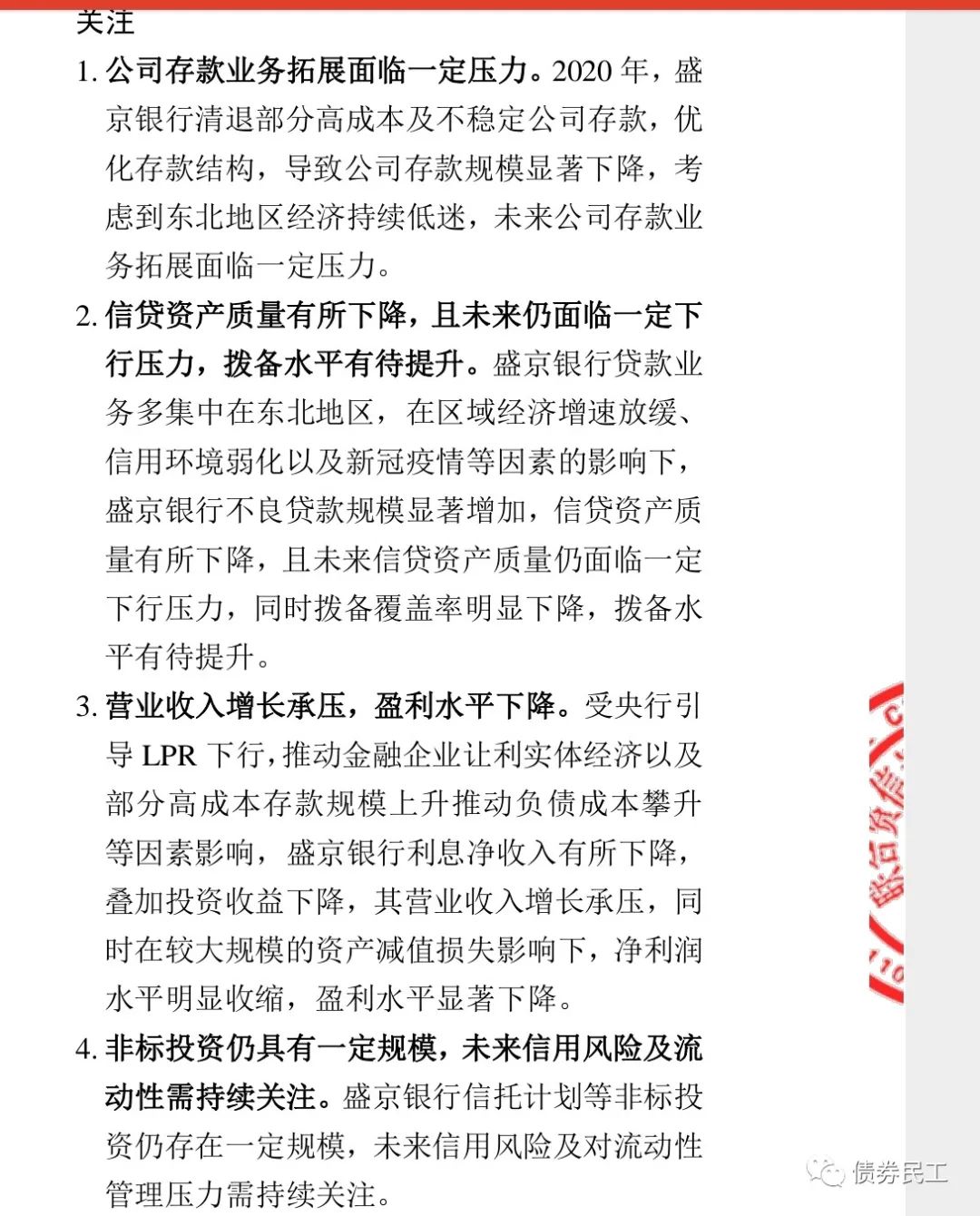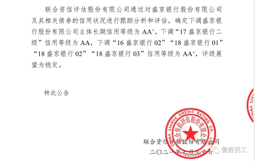 根據聯合資信2021年7月30日出具的跟蹤評級報告,盛京銀行股份有限公司(以下簡稱“盛京銀行”)的主體長期信用等級由AAA下調至AA+。根據公開披露的盛京銀行財務數據,截至2020年末,盛京銀行的資產總額為10379.58億元,是國內為數不多的資產破萬億的城商行。目前國內資產破萬億的城商行包括北京銀行、上海銀行、江蘇銀行、南京銀行、寧波銀行、徽商銀行、杭州銀行和盛京銀行。