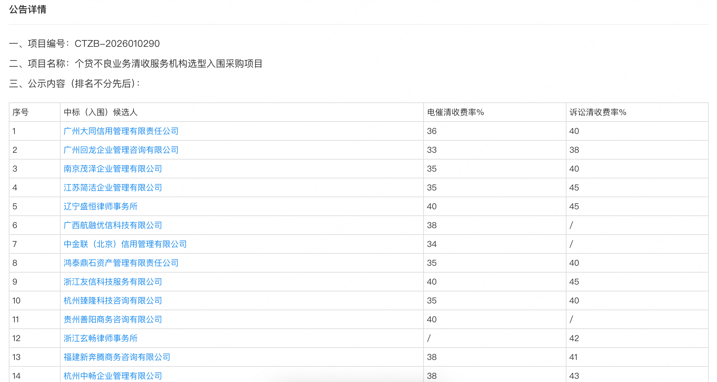附:光大金甌資產(chǎn)管理有限公司個(gè)貸不良業(yè)務(wù)清收服務(wù)機(jī)構(gòu)選型入圍采購項(xiàng)目中標(biāo)公示名單