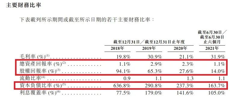 而資本負債比率,2018年末一度高達636.8%,2019年末為290.8%、2020年末為237.3%,2021上半年為163.7%。