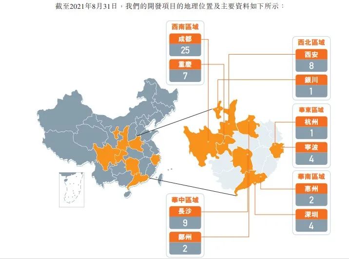 如招股書所言,合能控股把物業(yè)開發(fā)及銷售業(yè)務的戰(zhàn)略地域重心,放在經(jīng)濟基礎雄厚的城市——經(jīng)濟增長潛力巨大的中國西南區(qū)域、中國西北區(qū)域、華中區(qū)域、華南區(qū)域及華東區(qū)域的十座城市。