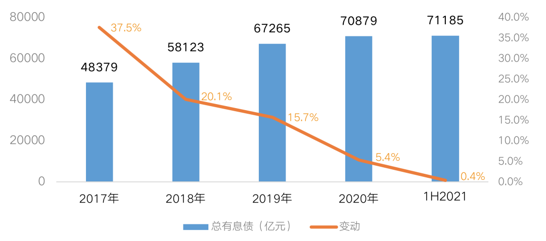 2021上半年末80家重點房企總有息債規(guī)模為71185億元,較期初增長0.4%,增速較于2020年的5.4%繼續(xù)下滑。房企的有息債增速在2017年到達高點后,隨著行業(yè)調(diào)控持續(xù),并表債務(wù)增速持續(xù)下滑,特別是三條紅線以來,受限于降檔要求,以及政策對各檔企業(yè)有息債增幅的限制,房企強化債務(wù)增量控制,并維持“量入為出”的狀態(tài)。