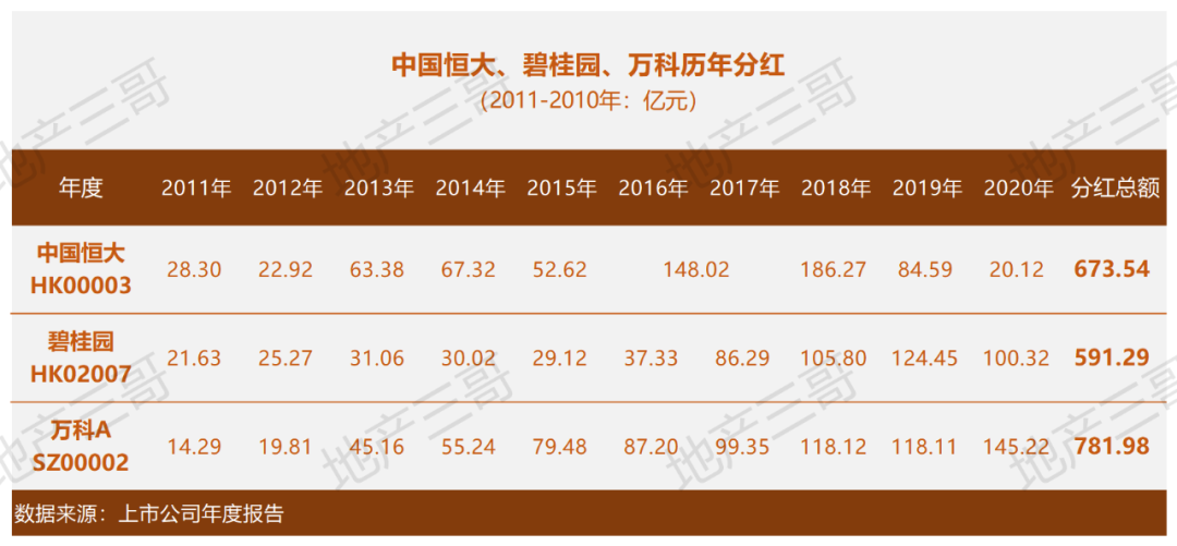 根據上市公司中國恒大各年年報,從附注中會計科目:股息,中國恒大十年分紅673億元(詳見下文中國恒大、碧桂園、萬科歷年分紅圖表)。