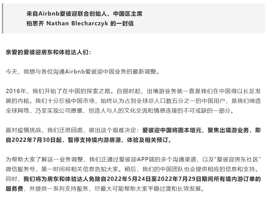 5月24日,全球民宿巨頭Airbnb(愛彼迎)聯(lián)合創(chuàng)始人、中國區(qū)主席柏思齊(Nathan Blecharczyk)通過“致愛彼迎中國房東和體驗達人社區(qū)的一封信”正式宣布,自2022年7月30日起,暫停支持境內(nèi)游房源、體驗及相關(guān)預(yù)訂。