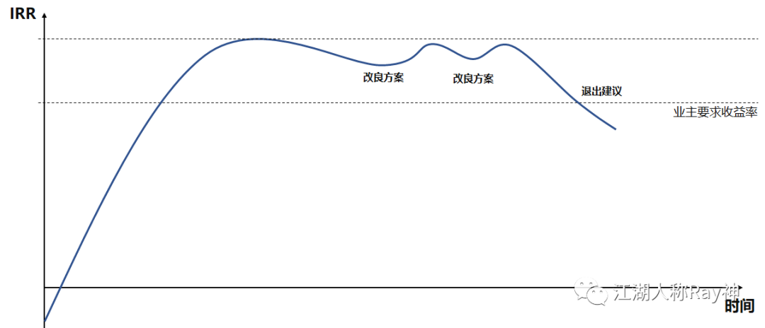 如果投資者的收益預期高于IRR,則NPV<0,持有該物業對投資者就沒有實現價值提升;反之則NPV>0,持有該物業就給投資者帶來了升值。這也就是為什么很多企業會選擇IRR來衡量投資及退出的標尺,一般可以使用IRR曲線進行評估分析——當IRR預期持續上升可以持有,當IRR預期持續下降需要監控,當IRR低于折現率需要考慮退出或改造。