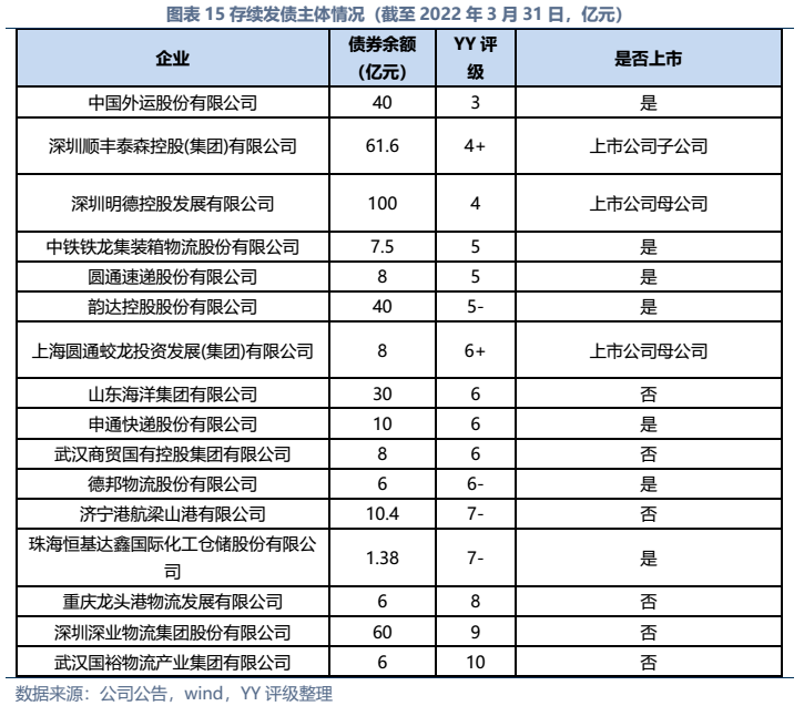 信用債市場(chǎng)方面,上市公司中高頻出現(xiàn)的“多式聯(lián)運(yùn)”、“智慧物流”、“供應(yīng)鏈管理”等概念在發(fā)債主體中熱度不高,主要仍以傳統(tǒng)物流企業(yè)為主。截至22年3月末,YY行業(yè)為物流的存續(xù)債主體共有16家,債券余額合計(jì)為402.88億元。行業(yè)整體毛利率不高(平均13%),杠桿率偏低(平均資產(chǎn)負(fù)債51.3%)。資質(zhì)方面,貨代龍頭中國(guó)外運(yùn)信用資質(zhì)最好,中鐵鐵龍集裝箱背靠國(guó)鐵集團(tuán)資源,信用資質(zhì)也較好。快遞細(xì)分領(lǐng)域集中度較高,市場(chǎng)格局相對(duì)穩(wěn)定,也有較強(qiáng)的經(jīng)營(yíng)獲現(xiàn)能力支撐,順豐、韻達(dá)、圓通信用資質(zhì)尚可,申通快遞盈利較差,資質(zhì)稍弱。濟(jì)寧港航梁山港、珠海恒基達(dá)鑫、重慶龍頭港等工業(yè)品物流企業(yè)信用資質(zhì)較弱。