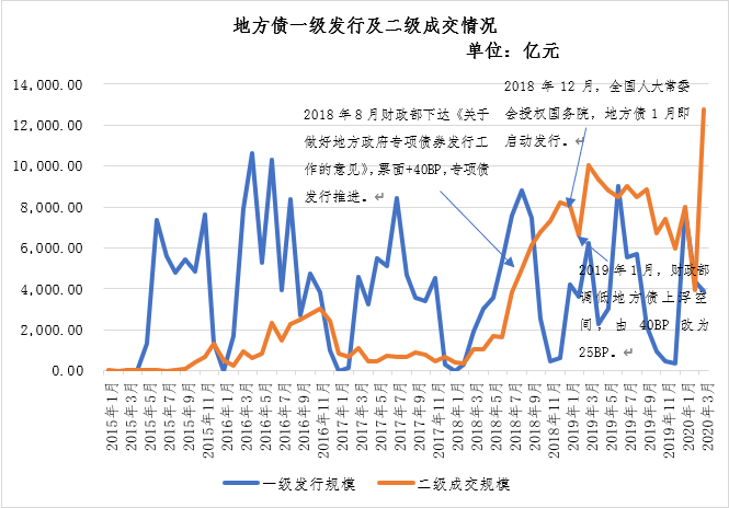 根據萬德數據顯示,2020年3月地方債交易規模創出歷史新高,交易規模達到1.2萬億,雖較于國債、同業存單約單動輒4、5萬億成交規模,仍屬于“弟弟范疇”。但較于2018年以前不足5000億的成交規模,已獲得長足進步。但與國債等活躍券種伴隨發行量擴大,交易規模呈現波動中上行不同(除去春節期間受假期影響),地方債部分時間點成交規模甚至不及前期。