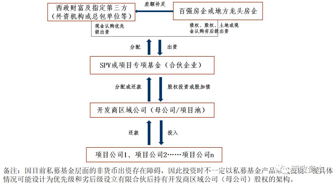在房企的融資業務中,經常涉及到自有資金的出資問題,前融機構提供的融資款與開發商的自有資金出資的比值就構成了配資比例。在配資款的注入過程中,開發商自有資金的出資主要有如下三種方式:第一種是開發商不需要出資,比如開發商和前融機構共同持股項目公司,但融資過程中開發商無需出資;第二種是開發商認繳但不實繳出資,比如我們在做融資產品的時候,開發商認購劣后級份額但不實繳,只是在我們前融無法退出時需承擔實繳義務,實際相當于增信措施;第三種是開發商必須按配資比例實繳出資,當然開發商也可能會尋找過橋資金解決自有資金的出資問題。為便于說明,我們就一些典型業務中的配資及產品架構逐一舉例說明。
