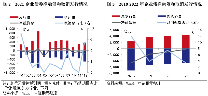 市場(chǎng)概況:(1)2021年企業(yè)債券發(fā)行491只,發(fā)行規(guī)模4,399.40億元,與上年同期相比分別上升27%和12%。(2)2021年企業(yè)債券總發(fā)行規(guī)模4,399.40億元,總償還規(guī)模4,707.55億元,凈融資-308.15億元,上年同期為-1,182.03億元。此外,2021年有23只企業(yè)債券取消發(fā)行,原計(jì)劃發(fā)行規(guī)模145.10億元,其中,有12只債券已擇期在年內(nèi)成功發(fā)行。