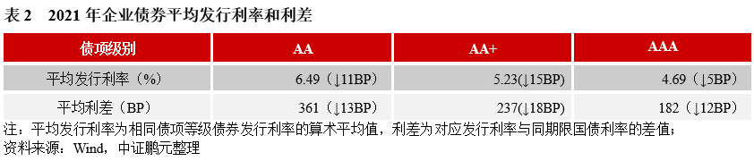 2021年,企業(yè)債券最高發(fā)行利率為8.00%,與上年下降50BP;最低發(fā)行利率為3.05%,較上年上行66BP。分債券級(jí)別來看,與上年相比,各級(jí)別企業(yè)債平均發(fā)行利均下行,平均發(fā)行利差均收窄,其中AA和AA+級(jí)較AAA級(jí)降幅較大。