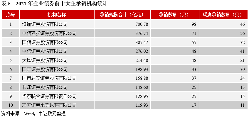 就承銷機(jī)構(gòu)而言,2021年共有75家機(jī)構(gòu)參與企業(yè)債券的承銷工作。海通證券承銷700.78億元,位居第一;中信建投證券承銷376.74億元,位居第二;國(guó)信證券承銷305.47億元,位居第三。前五大機(jī)構(gòu)的承銷規(guī)模合計(jì)占比59.8%,市場(chǎng)集中度較高。