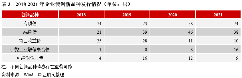 2021年企業(yè)債創(chuàng)新品種合計(jì)144只,較上年增加14只,占比29.3%,較上年下降4.3個(gè)百分點(diǎn)。第一,發(fā)改委專項(xiàng)債是企業(yè)債市場(chǎng)主要?jiǎng)?chuàng)新品種,在全市場(chǎng)占比約15%。其中,停車場(chǎng)建設(shè)專項(xiàng)債券37只,是專項(xiàng)債主要品種;縣城新型城鎮(zhèn)化建設(shè)專項(xiàng)債券14只,為新增的專項(xiàng)債創(chuàng)新品種;另外,農(nóng)村產(chǎn)業(yè)融合發(fā)展專項(xiàng)債券8只,較往年明顯增長(zhǎng),而地下綜合管廊建設(shè)專項(xiàng)債券本年發(fā)行4只,較往年出現(xiàn)明顯下降。第二,小微企業(yè)增信集合債受政策推動(dòng),2021年發(fā)行數(shù)量增長(zhǎng)100%。主要由地級(jí)市城投公司發(fā)行,2018年來,共有12家地級(jí)市城投公司發(fā)行14只小微企業(yè)增信集合債,占比56%。第三,綠色債受政策推動(dòng),2018年來呈現(xiàn)增長(zhǎng),2021年數(shù)量有所減少。“碳達(dá)峰、碳中和”目標(biāo)的提出,進(jìn)一步推動(dòng)了綠色金融的發(fā)展,2021年綠色債券發(fā)行規(guī)模3720.85億元,較上年增長(zhǎng)115%。其中,綠色企業(yè)債發(fā)行38只,較上年下降17%。與其他債券品種的快速增長(zhǎng)有關(guān)。