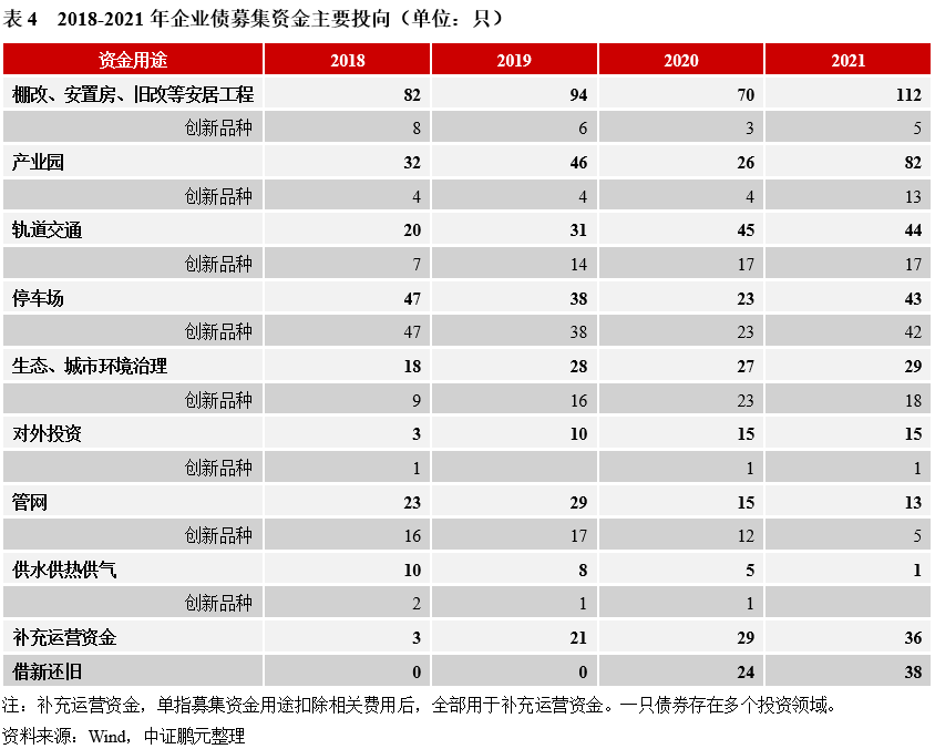 從募集資金用途看,棚改、安置房等安居工程是企業(yè)債的主要投向,占比23%左右,其次是產(chǎn)業(yè)園相關(guān)項(xiàng)目2021年出現(xiàn)明顯增加,數(shù)量占比17%,軌道交通和停車場(chǎng)項(xiàng)目占比也相對(duì)較高,各占9%。此外,2020年來,借新還舊和全額補(bǔ)充運(yùn)營(yíng)資金(扣除相關(guān)發(fā)行費(fèi)用后)明顯增加。結(jié)合創(chuàng)新品種看,除停車場(chǎng)長(zhǎng)期以發(fā)行專項(xiàng)債為主外,生態(tài)、城市環(huán)境治理領(lǐng)域發(fā)行創(chuàng)新品種的占比也較高,主要為綠色債,軌道交通和管網(wǎng)領(lǐng)域創(chuàng)新品種也較多,其他領(lǐng)域中創(chuàng)新品種較少。