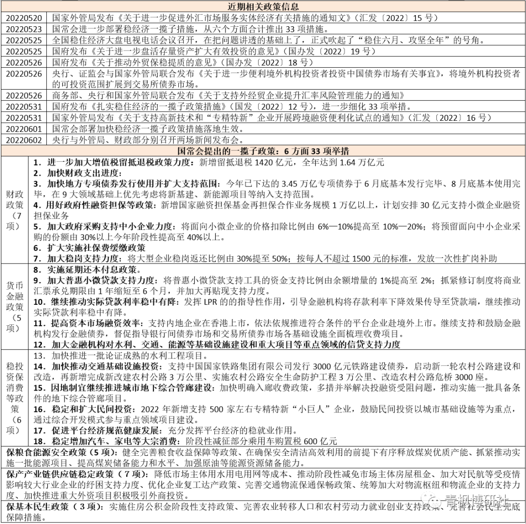 2022年4月18日,央行和外管局聯合發布《關于做好疫情防控和經濟社會發展金融服務的通知》(也即23條,參見放松之路全面開啟),已經在很多方面傳遞了較為寬松的信號,只不過當時銀保監會沒有參加。此次國常會提出的33項舉措中,與央行、外管局有關的貨幣金融政策有5項、其它配合性政策11項。為響應國常會提出的33項舉措,2022年6月2日,央行與與外管局舉行新聞發布會,解讀國常會部署有關扎實穩住經濟的金融政策。要點如下,