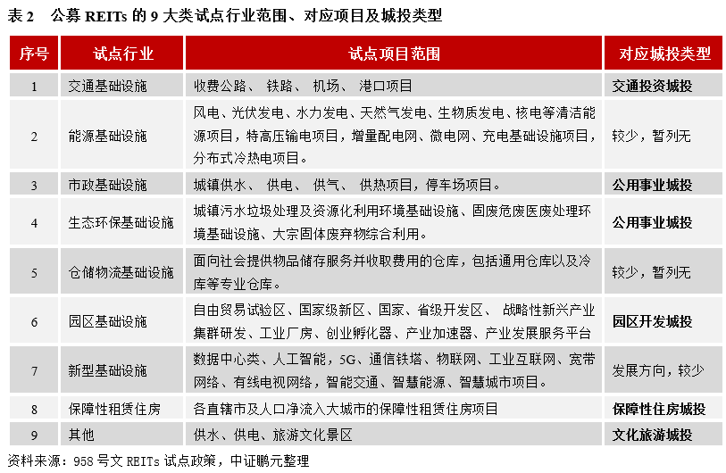 首先根據業務范圍與特點,劃分城投主體類型,一一對照政策要求的試點范圍行業和發行要求,城投主體分類與公募REITs試點的行業范圍詳見表1和表2。