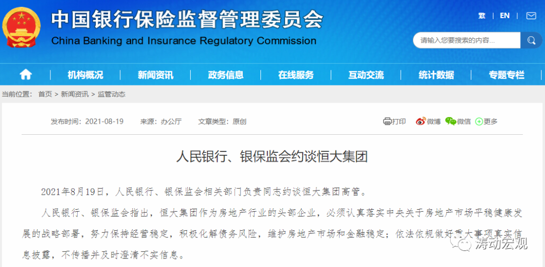 (一)2021年8月19日,央行和銀保監會官網發文“人民銀行、銀保監會約談恒大集團”。這算是金融管理部門首次給談地產企業并進行官網披露,表明恒大事件目前可能已經超出了政策部門的容忍范圍。