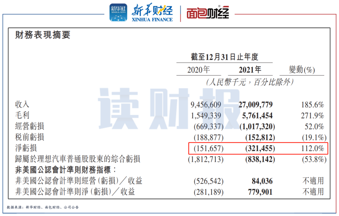 幾家造車新勢力企業中,理想汽車率先交出2021年度業績答卷,虧損同比擴大近一倍。