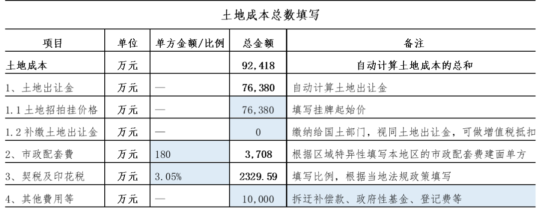 因此在投資測算模型中,對于土地成本的設置,應體現上述細項,至少包含契稅、市政配套費、其他費用等。如公開招拍掛項目無需另外設置拆遷補償款,已在土地出讓金中體現。如下表中,土地成本總和為下列四項之和。