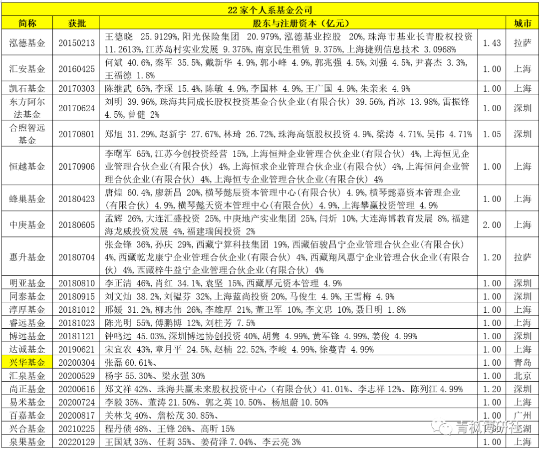 (一)41號文明確提出審慎有序核準自然人發起設立基金管理公司,這實際上是收緊自然人發起設立基金公司的措辭,后續將強化對自然人的審核。根據統計,目前共有22家個人系基金公司獲批(2015與2016年各1家、2017年4家、2018年8家、2019年1家、2020年5家以及2021-2022年各1家),數上已非常可觀,且資質上整體偏弱,繼續擴容的必要性已經沒了。