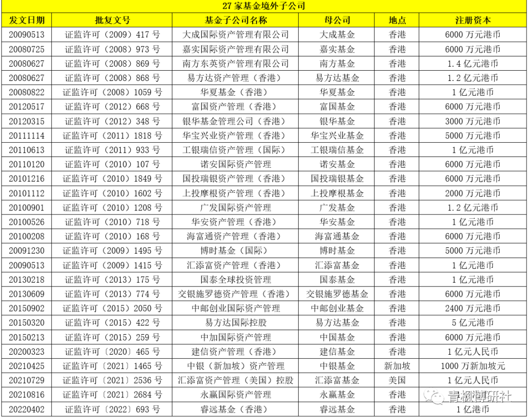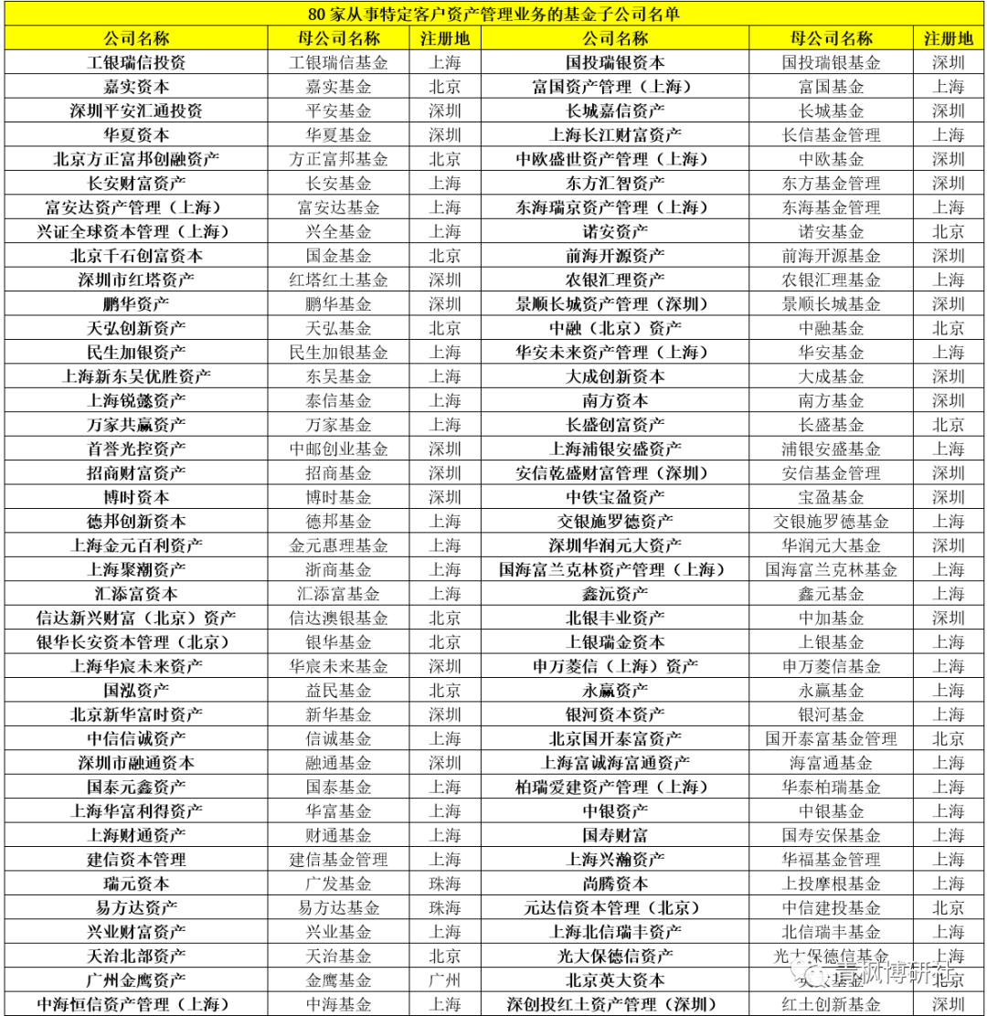 根據證監會公布的數據,截至目前,共有80家從事特定客戶資產管理業務的基金子公司,共有27家基金公司設立了境外子公司(美國1家、新加坡1家以及香港25家),名單具體見下表。
