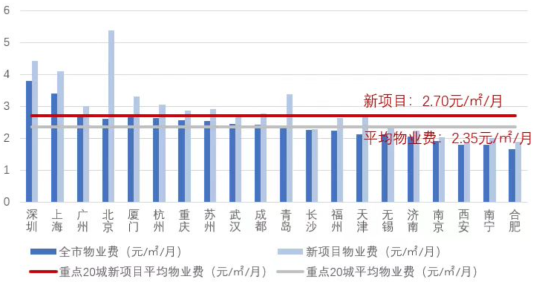 根據克而瑞物管監測,重點20城平均物業費為2.35元/平方米/月,而樓齡5年及以下的項目平均物業費為2.7元/平方米/月,相較于平均水平高出15%。