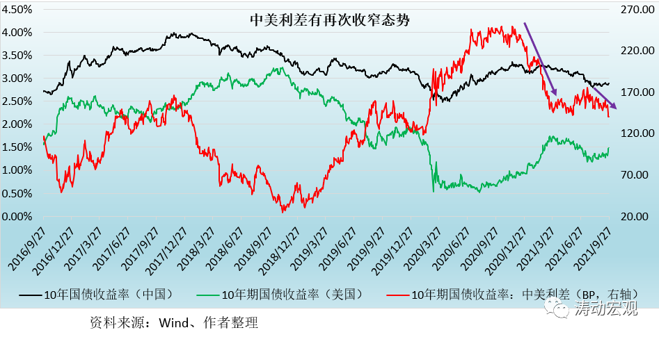 目前中美利差已由去年250BP的高點(diǎn)收窄至目前的140BP左右,而中美利差收窄的原因是顯然的,且這些原因在未來(lái)還會(huì)持續(xù)下去。