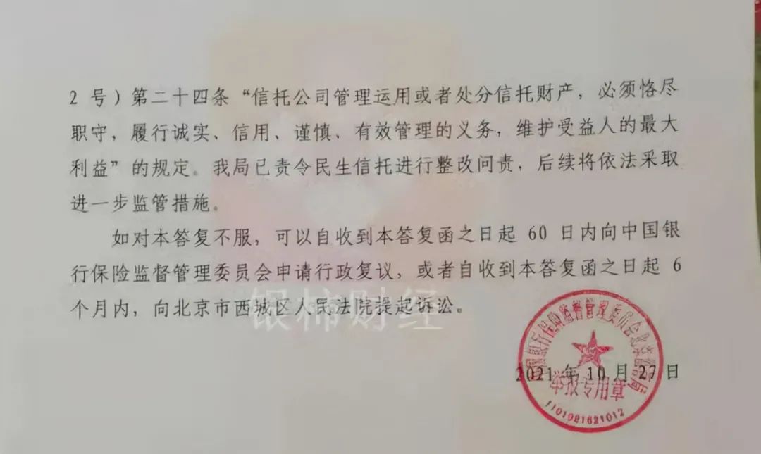 9月份,筆者曾報(bào)道過(guò)民生信托旗下置信316號(hào)出現(xiàn)風(fēng)險(xiǎn)的情況,來(lái)自北京銀保監(jiān)局出具的《舉報(bào)調(diào)查意見(jiàn)書》中顯示,該產(chǎn)品未向投資人進(jìn)行信息披露,信托資金運(yùn)用與信托合同定不符等等。并且責(zé)令民生信托進(jìn)行整改問(wèn)責(zé),后續(xù)將依法進(jìn)一步采取行動(dòng)。