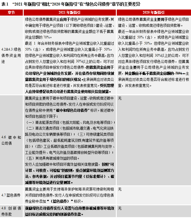 與2020年版指引相比,新版指引主要是強(qiáng)化約束綠色債券募集資金用途,新增“碳中和綠色債券”、“藍(lán)色債券”、“鄉(xiāng)村振興公司債”等債券品種的發(fā)行規(guī)則,同時(shí)修訂了對(duì)應(yīng)債券品種的監(jiān)管要求。