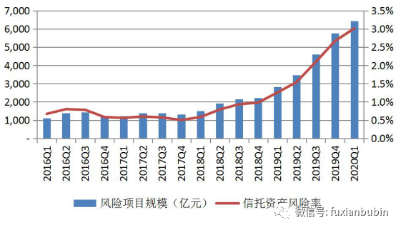 二是信托行業(yè)風(fēng)險資產(chǎn)規(guī)模及不良率持續(xù)攀升。在金融去杠桿、強(qiáng)監(jiān)管的宏觀政策背景下,銀行表外資金加速回表,同時平臺公司舉債受限,企業(yè)現(xiàn)金流相對緊張,部分信托公司展業(yè)較為激進(jìn),前期高速發(fā)展積聚的風(fēng)險開始加速釋放,導(dǎo)致信托計劃逾期甚至違約事件增多。早在2020年一季度,信托業(yè)協(xié)會在2020年6月發(fā)布的《2020年1季度中國信托業(yè)發(fā)展評析》中表示,隨著風(fēng)險資產(chǎn)規(guī)模的增加以及行業(yè)整體信托資產(chǎn)規(guī)模的壓降,信托資產(chǎn)風(fēng)險率也在持續(xù)提升。2020年1季度末,信托業(yè)資產(chǎn)風(fēng)險率為3.02%,較2019年末提升0.35%;但環(huán)比增幅較2019年末的0.57%下降了0.22個百分點。從風(fēng)險項目數(shù)量和風(fēng)險資產(chǎn)規(guī)模的環(huán)比變動來看,2020年1季度末,信托業(yè)風(fēng)險項目個數(shù)為1626個,環(huán)比增加79個,增幅為5.11%。2020年1季度末,信托行業(yè)風(fēng)險資產(chǎn)規(guī)模為6431.03億元,環(huán)比增加660.56億元,增幅11.45%。從同比來看,2020年1季度末信托項目數(shù)量和風(fēng)險資產(chǎn)規(guī)模同比增幅分別為61.63%和127.20%。2020年1季度,在新冠疫情以及監(jiān)管部門加大風(fēng)險排查力度的影響下,信托行業(yè)風(fēng)險仍在持續(xù)暴露。但預(yù)計信托風(fēng)險資產(chǎn)規(guī)模變化2020年將趨平穩(wěn),行業(yè)風(fēng)險整體可控。