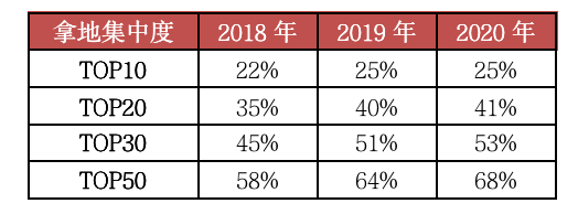 表:銷(xiāo)售50強(qiáng)房企2018年至2020年拿地建面集中度情況