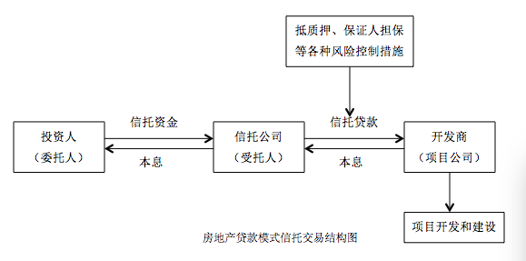 信托公司通過信托計劃向投資人募集資金并向房地產公司、政府平臺、上市公司、大型集團公司等發放貸款,融資方以其關聯資產進行抵質押、保證人擔保等各種風險措施保證債權安全,到期后由融資方還本付息。