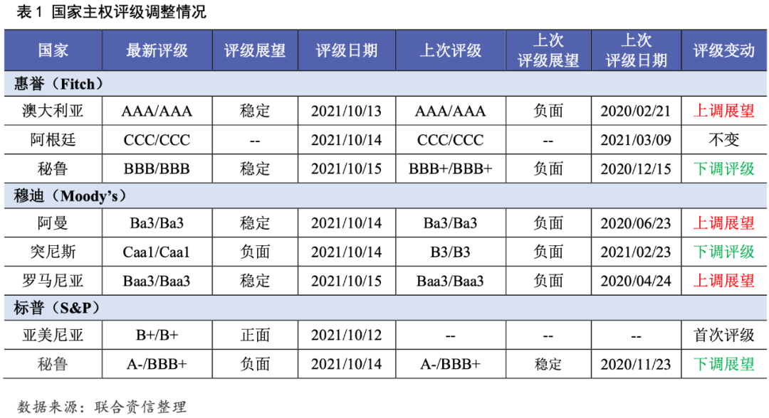 10月13日,惠譽維持澳大利亞長期本、外幣主權信用級別為“AAA”,評級展望上調至“穩定”。惠譽認為,得益于經濟的復蘇,澳大利亞的財政和政府債務情況均會有所好轉,雖然近期受新一輪疫情暴發的影響,澳大利亞推行的封鎖措施阻礙了經濟復蘇進程,但并不影響長期的經濟復蘇趨勢。惠譽指出,澳大利亞的外部脆弱性較高,對外部門與同級別國家相比較為疲軟。惠譽預測,2022年澳大利亞政府財政赤字將小幅收窄至6.7%,政府債務比率將達到60.9%。